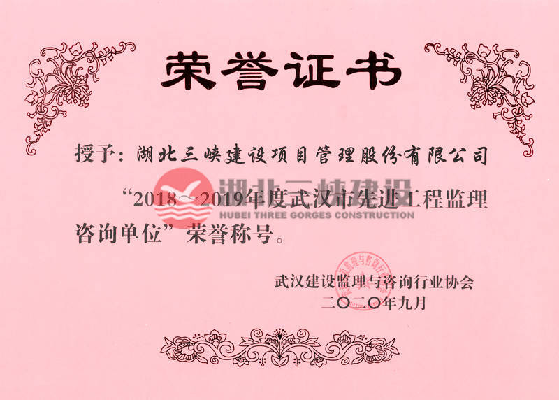 “2018~2019年度武漢市先進工程監理咨詢單位”榮譽稱號