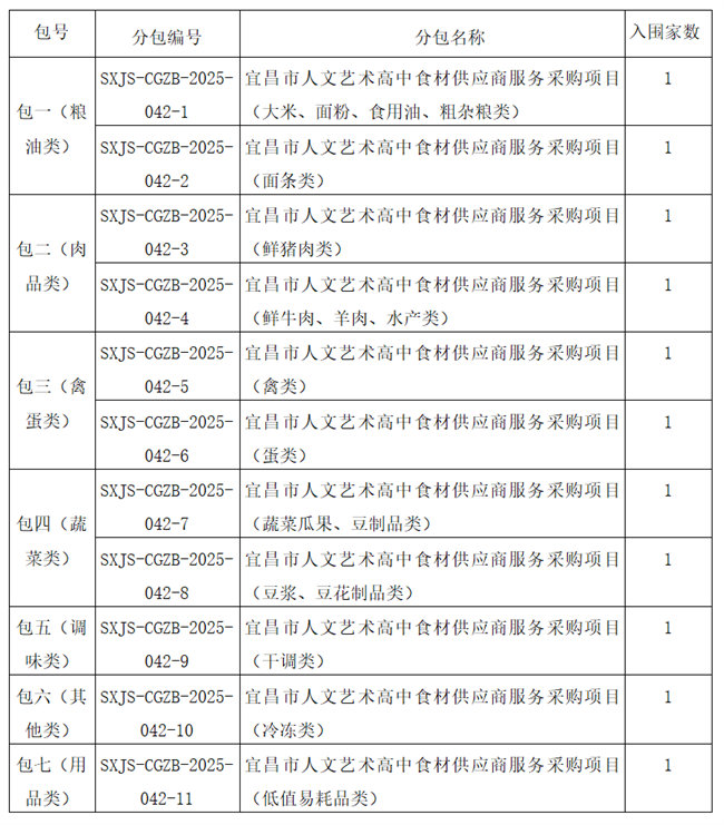 【項(xiàng)目概況】 宜昌市人文藝術(shù)高中食材配送供應(yīng)商服務(wù)采購項(xiàng)目的潛在供應(yīng)商應(yīng)在宜昌市發(fā)展大道57-6號(hào)三峽云計(jì)算大廈A座20樓獲取招標(biāo)文件,并于2025年7月23日09點(diǎn)00分(北京時(shí)間)前遞交投標(biāo)文件。 一、項(xiàng)目基本情況 1.項(xiàng)目編號(hào):SXJS-CGZB-2025-042 2.項(xiàng)目名稱:宜昌市人文藝術(shù)高中食材配送供應(yīng)商服務(wù)采購項(xiàng)目 3.采購方式:公開招標(biāo) 4.采購需求:宜昌市人文藝術(shù)高中食材配送供應(yīng)商服務(wù)采購項(xiàng)目共11個(gè)分包,具體分包如下,每個(gè)分包公開遴選一家供應(yīng)商(備選兩名排名第二、第三的供應(yīng)商)為宜昌市人文藝術(shù)高中提供為期三年的物資供應(yīng)。(詳見招標(biāo)文件第三章采購需求)