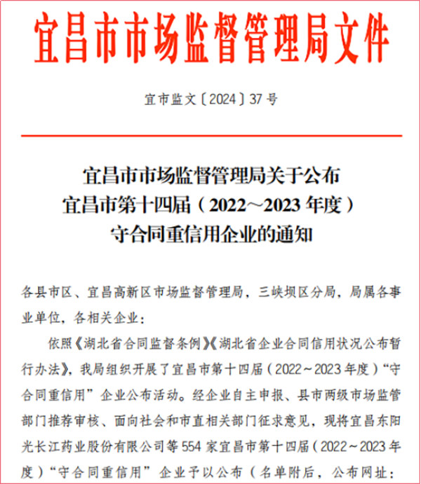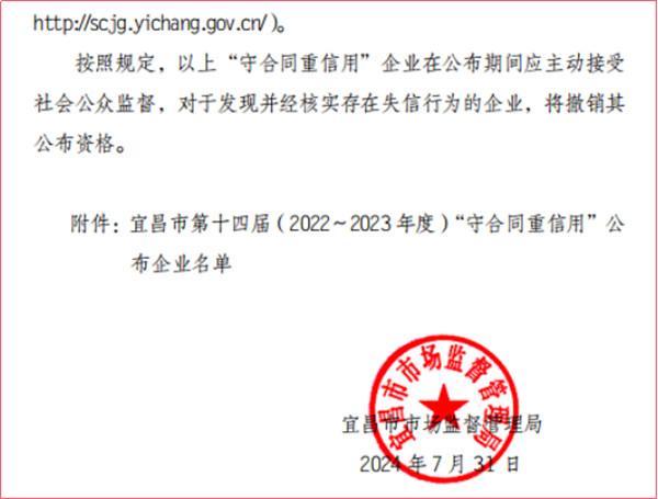 近日,在湖北省市場監督管理局和宜昌市市場監督管理局公布的湖北省第十七屆 (2022—2023年度)“守合同重信用”企業及宜昌市第十四屆(2022-2023年度)“守合同重信用”企業名單中,我公司再度被評為省、市兩級“守合同重信用”企業,這是我公司連續第九年蟬聯湖北省省級“守合同重信用企業”榮譽稱號。