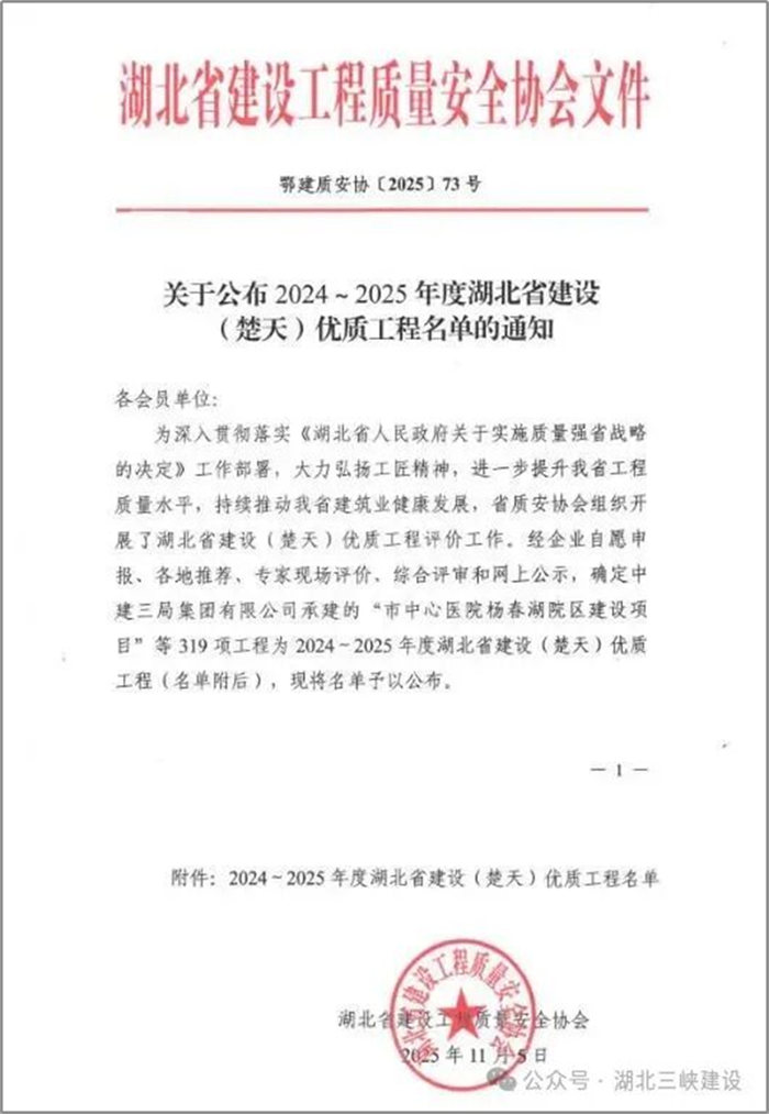 熱烈祝賀我公司在2024-2025年度湖北省建設(楚天)優質工程名單中,湖北三峽建設項目管理股份有限公司(含原宜昌平湖工程建設監理有限責任公司)等5個項目榮獲我省“楚天杯”!