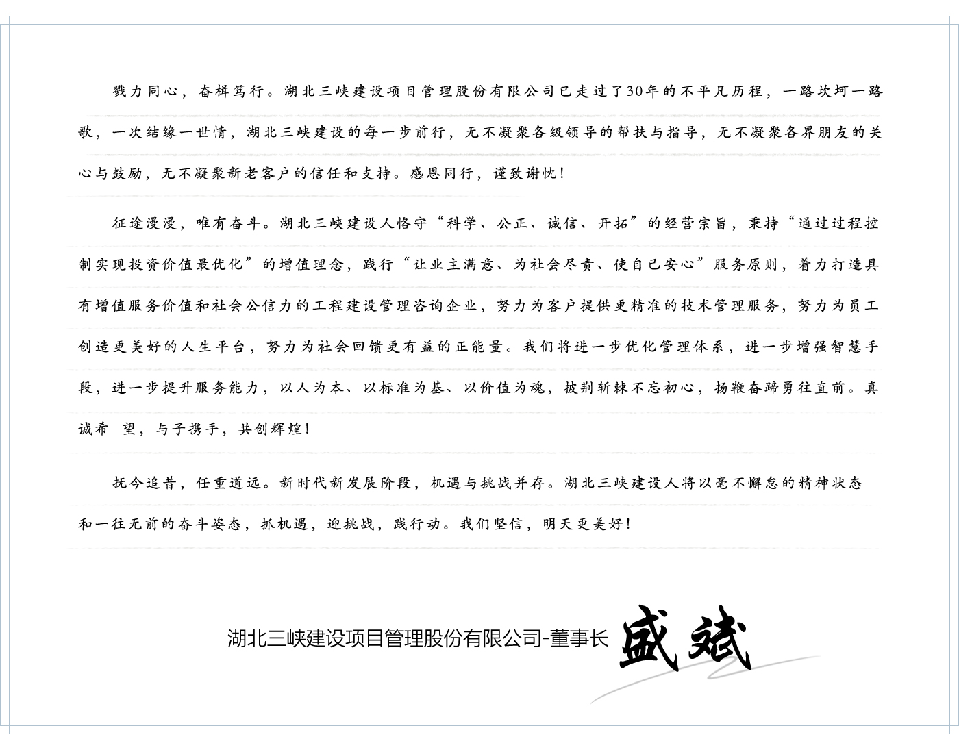 新時代新征程新夢想,湖北三峽建設(shè)項目管理股份有限公司將以培育和發(fā)展新質(zhì)生產(chǎn)力為指針,遵循科學(xué)理念、創(chuàng)新管理機制、提升服務(wù)效能,竭誠為客戶提供更優(yōu)質(zhì)的工程管理咨詢服務(wù),為建設(shè)成為客戶信賴、服務(wù)增值、效能卓越的一流工程管理咨詢企業(yè)而努力奮斗。